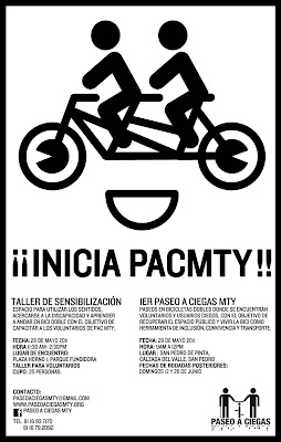 Monterrey, México (26 mayo 2011).- Pedalear no es sólo una rutina saludable y divertida. La experiencia adquiere un matiz extraordinario cuando ese paseo en bicicleta por las calles de la Ciudad se realiza, literalmente, a ciegas.
