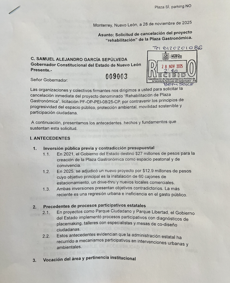 Organizaciones civiles y colectivos entregaron hoy al Gobernador de Nuevo León una solicitud formal para cancelar el proyecto de “rehabilitación” de la Plaza Gastronómica, ubicada en el Centro de Monterrey.