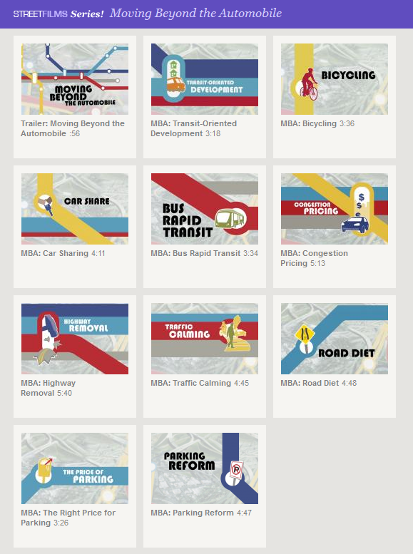 Moving Beyond the Automobile (Moviéndonos más allá del automóvil) es una excelente serie de 10 videos que produjo la organización StreetFilms, en los que se exploran soluciones para el problema de la dependencia del automóvil.