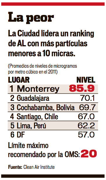 En el ranking de PM10, después de Monterrey se encuentra Guadalajara, seguido por Cochabamba, Bolivia; Santiago, Chile, y Lima, Perú. En sexto está el Distrito Federal.
