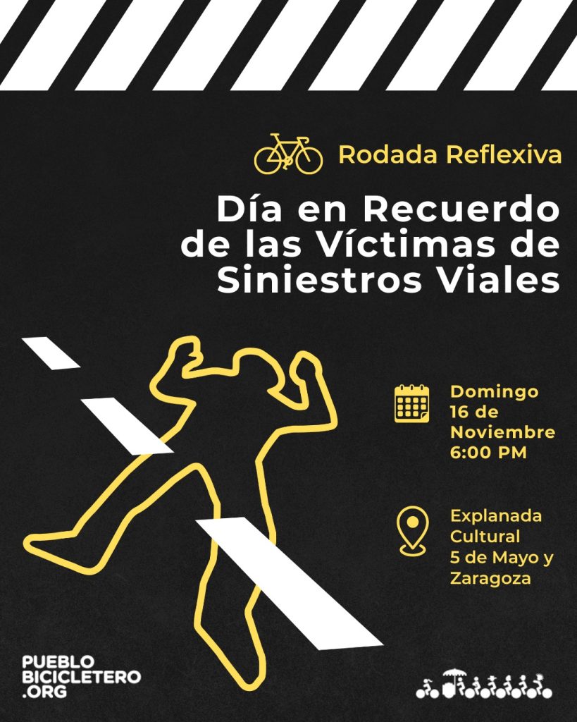 Rodaremos por algunas bicicletas blancas para recordar a Jhonny Hernández y su hijo Víctor, Felipe del Rivero, Luis Osvaldo Samaniego, Eliseo Hernández y otro ciclista no identificado, por el Centro de Monterrey y nos detendremos frente al mural «En Tu Nombre Exigimos Justicia Vial» (afuera de la estación Félix U. Gómez del Metro) para recordarlos y manifestar nuestro dolor con un performance en ese sitio.