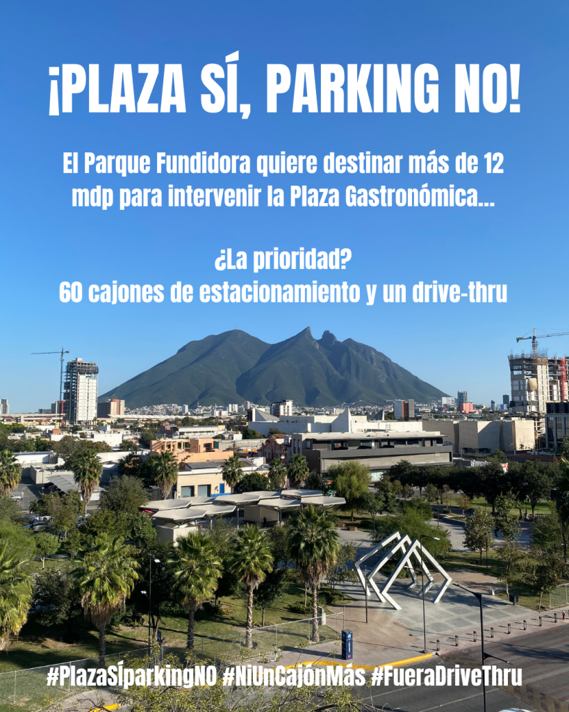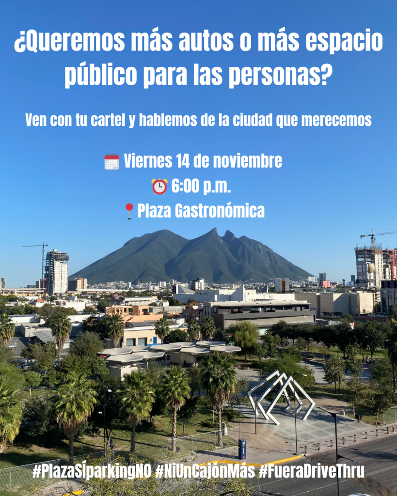 Invitamos a la ciudadanía a alzar la voz y sumarse a esta defensa del espacio público firmando la petición en línea disponible en change.org/plazaSI-parkingNO. Asimismo, convocamos a una manifestación el viernes 14 de noviembre a las 6:00 p.m. en la Plaza Gastronómica, bajo el lema “Plaza SÍ, parking NO: Porque el espacio público vale más que un cajón de estacionamiento”. Llamamos a todas y todos a venir con su cartel y sumarse a la conversación sobre el futuro de nuestros espacios públicos.