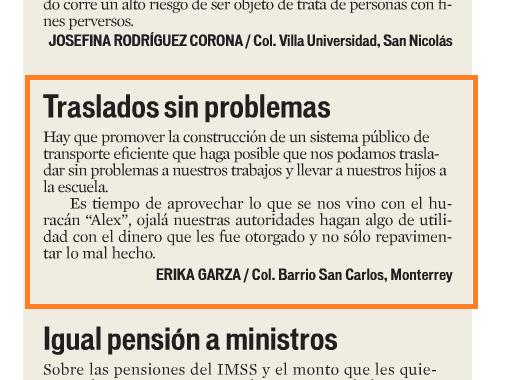 La carta en El Norte de una ciudadana que va directo al grano: urge un sistema público de transporte colectivo. En el contexto de la destrucción de la ciudad -por la mala planeación y diseño urbano-, debe empujarse la aplicación del dinero público en soluciones sustentables para la movilidad urbana.