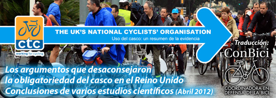 Así lo refleja el informe Cycle helmets: Summary of the evidence, realizado por The National Cycling Charity (CTC), del Reino Unido, el cual se exponen las razones, respaldadas en pruebas concluyentes, para que el uso del casco no sea obligatorio por ley ni sea objeto de campañas promocionales.