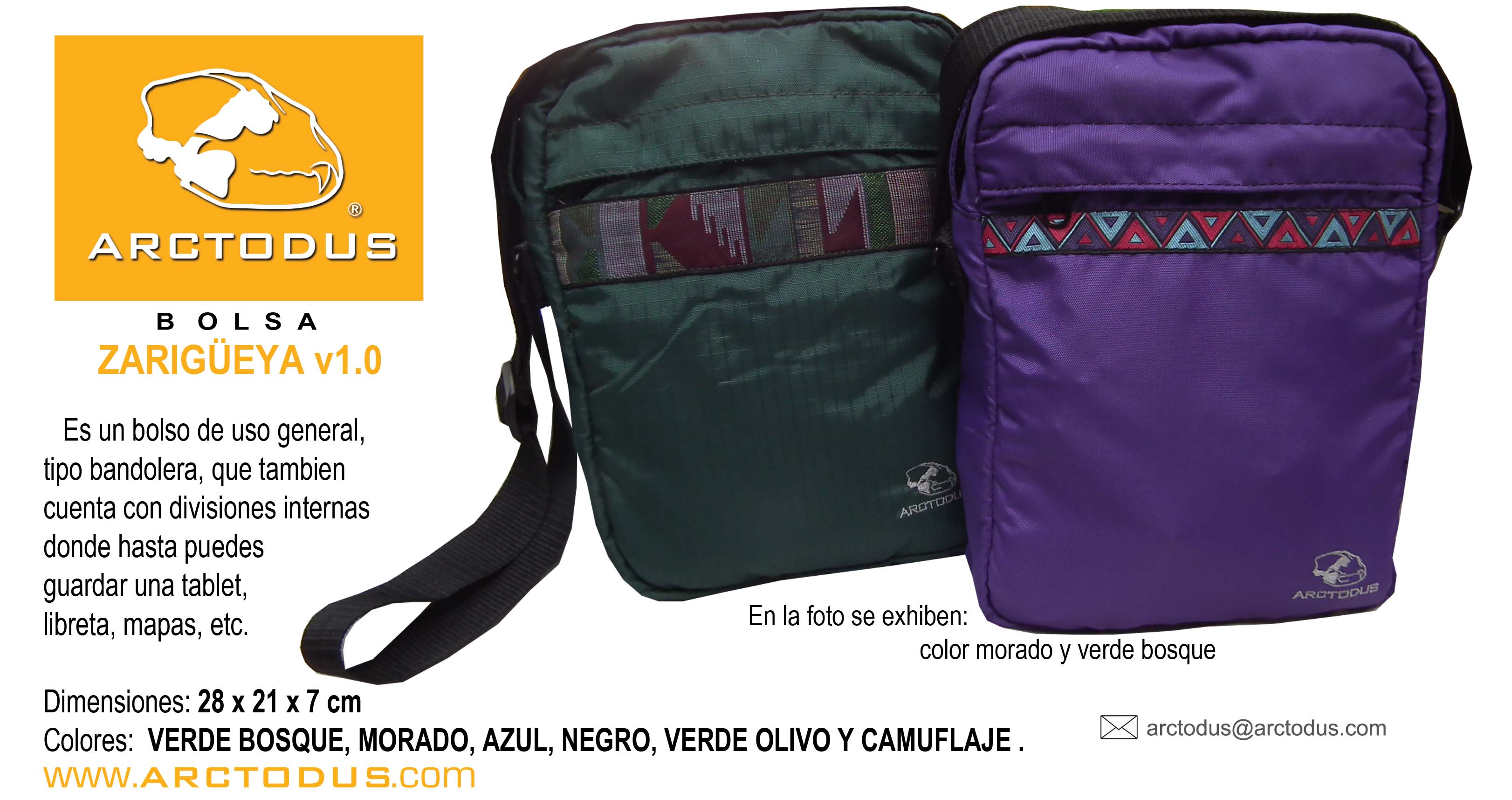 Bolsa ARCTODUS. Modelo: Zarigüeya V1.0. Descripción: Bolso de uso general, tipo bandolera, que también cuenta con divisiones internas donde puedes guardar mapas, libros o hasta una tablet. 28 x 21 x 7 cm.