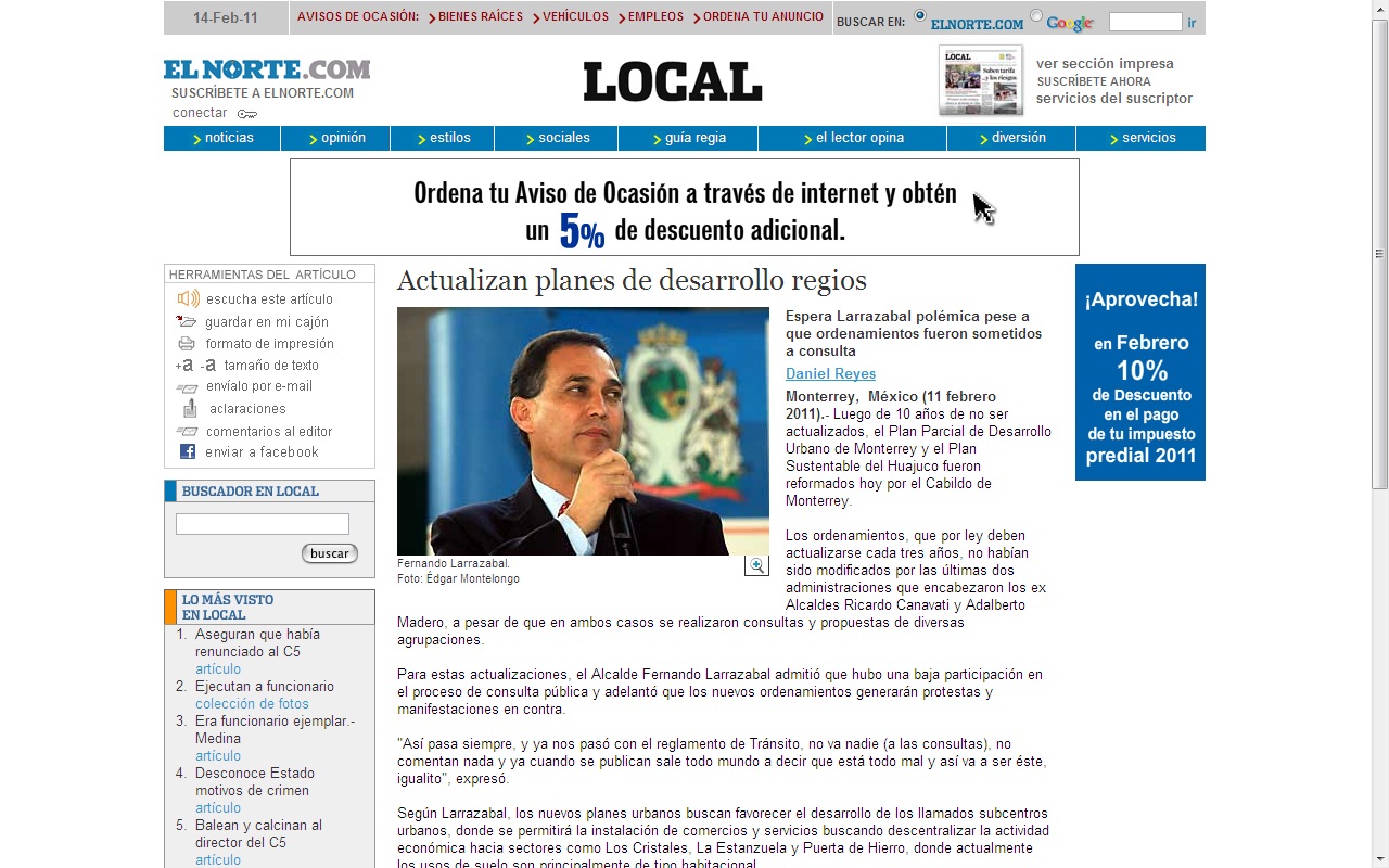 El 11 de febrero El Norte publicó la nota «Actualizan planes de desarrollo regios«, en la que se consignan declaraciones de Fernando Larrazabal, presidente municipal de Monterrey respecto a la participación de la ciudadanía en consultas públicas.