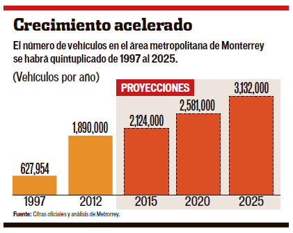 En el 2012 tenemos en la zona metropolitana 1 millón 890 mil autos y se espera que para el 2025 sean 3 millones 132 mil vehículos motorizados.