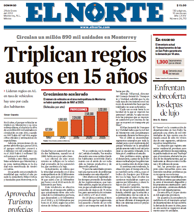 Tan sólo en la actualidad «se estima que la velocidad promedio en el área metropolitana es de 25 kilómetros por hora, pero para el 2015 se prevé que caerá a los 22 kilómetros por hora y en el 2020 será de 20kilómetros por hora», reporta El Norte.