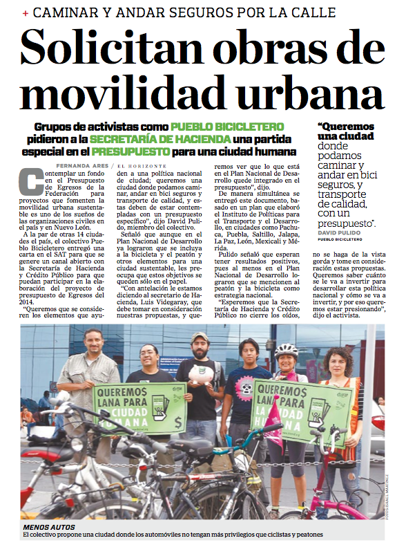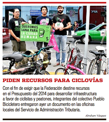 Miembros del colectivo Pueblo Bicicletero pidieron este martes que dentro del proyecto de Presupuesto de Egresos de la Federación 2014 se incluyan recursos destinados a financiar infraestructura para la movilidad y el desarrollo urbano sustentable.