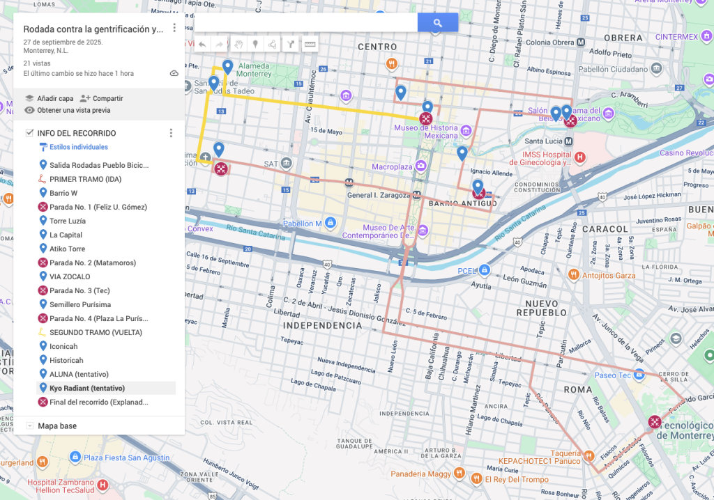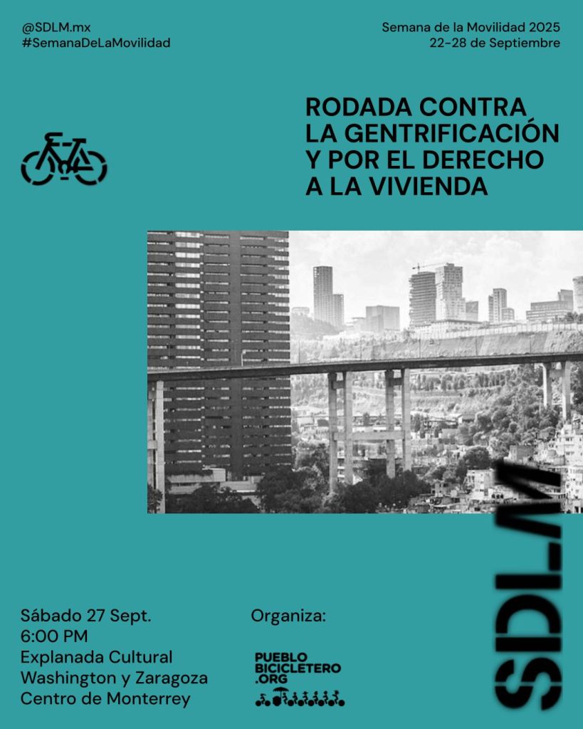 En el marco de la Semana de la Movilidad 2025, este sábado 27 de septiembre salimos en bicicleta para recorrer juntas y juntos el centro de Monterrey y visibilizar la crisis de vivienda que atraviesa nuestra ciudad.